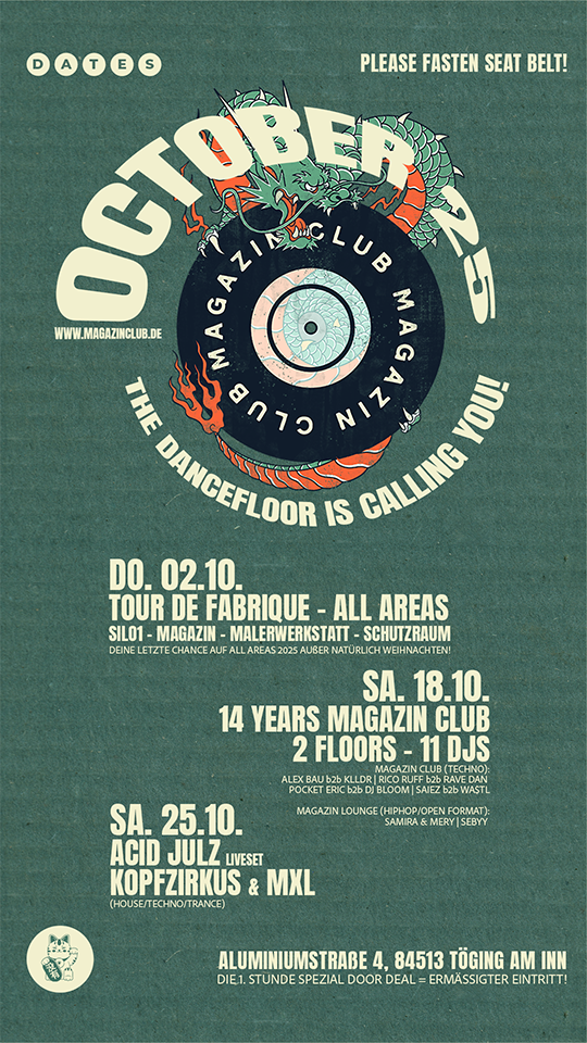der club befindet sich in einem silokomplex in töging am inn oder auch gerne genannt im "siloland". dort ist das magazin gemeinsam mit seinem doppelt so alten großen bruder/partner dem silo1 sowie der malerwerkstatt und dem schutzraum beheimatet.